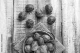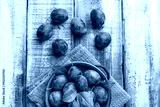 Plums overhead fresh arrangement on blue plate and kitchen cloth and rustic white wooden table studio shot