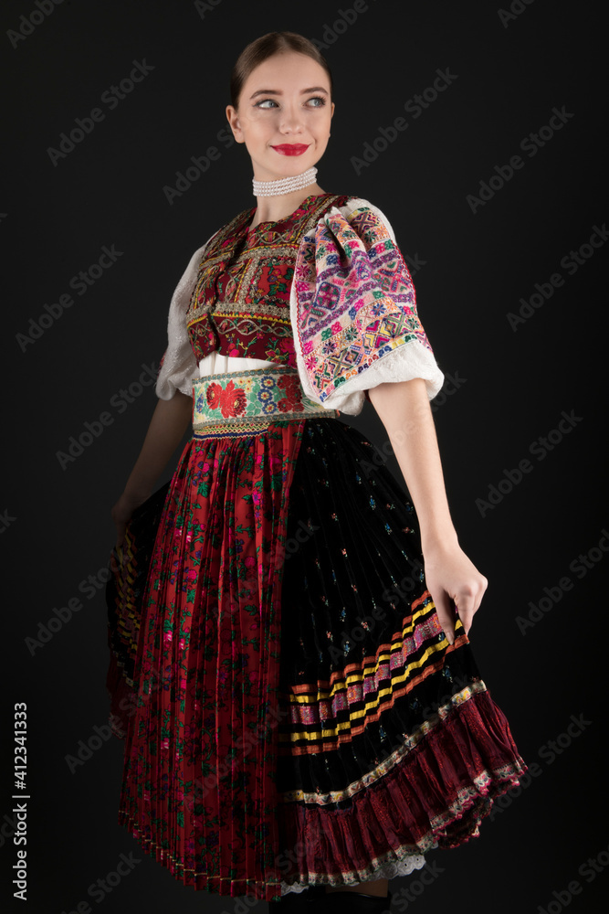 Young beautiful slovak woman in traditional dress. Slovak folklore