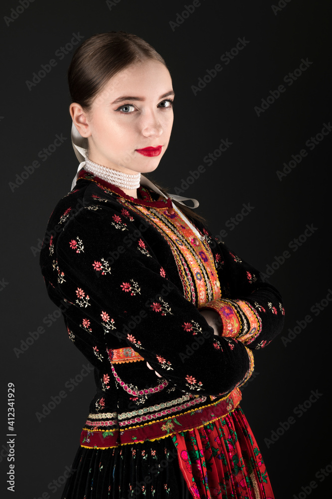 Young beautiful slovak woman in traditional dress. Slovak folklore