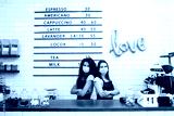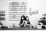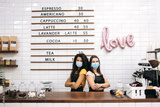Two female waitress a coffee shop or restaurant, African American and Caucasian, stands behind the bar counter wearing medical masks, backs to each other with arms crossed and looking at the camera