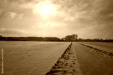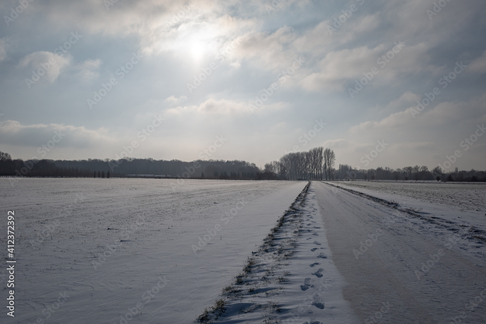 Outdoor scenery view on street along land and field covered with thick layer snow and background of cloudy overcast sky in countryside in Germany during winter season.