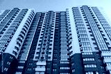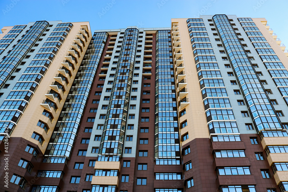 New high-rise carcass residential building, facade. Modern construction of apartment buildings.