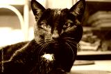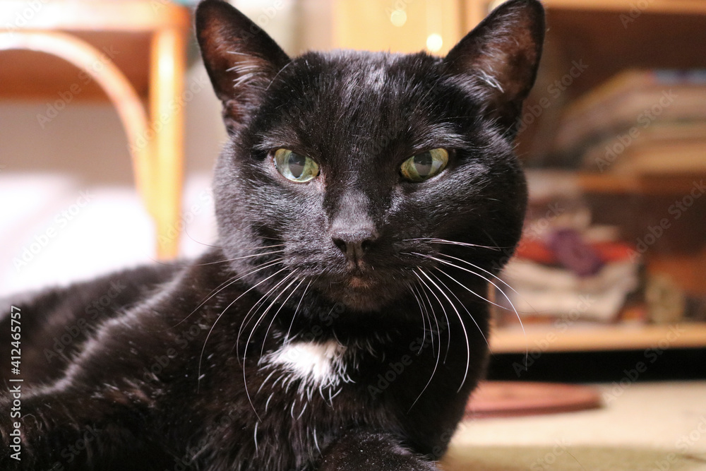 Portrait of a black elderly cat with a grizzled mustache. Pets.