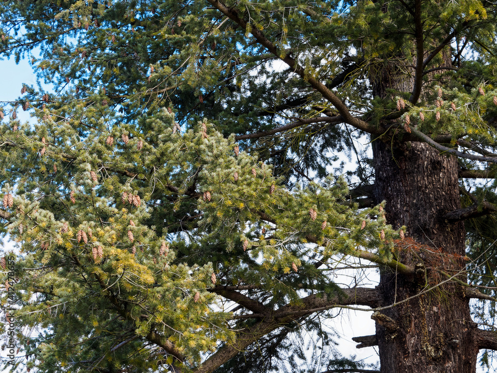 (Pseudotsuga menziesii) Oregon pine or douglas-fir pendulous female cones under branches encircled by flat and lineaire green leaves