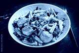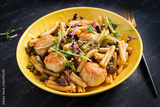 Caserecce pasta with meatballs in sweet and sour sauce and vegetables in bowl.