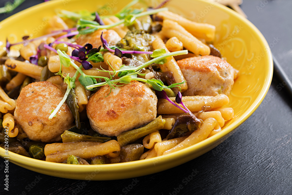 Caserecce pasta with meatballs in sweet and sour sauce and vegetables in bowl.