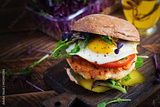 Hamburger. Sandwich with chicken burger, tomatoes, pickled cucumber and fried egg. Fresh tasty chicken burger on wooden table.