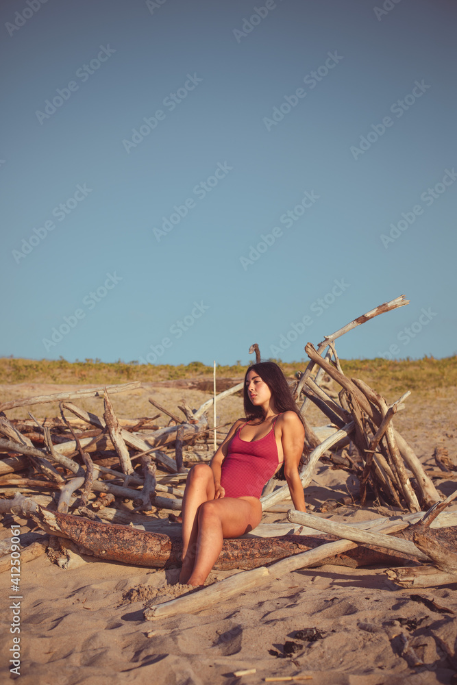 Natural beauty young woman in retro swimwear relaxing at the beach on summer vacation.