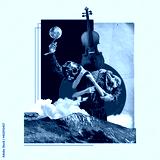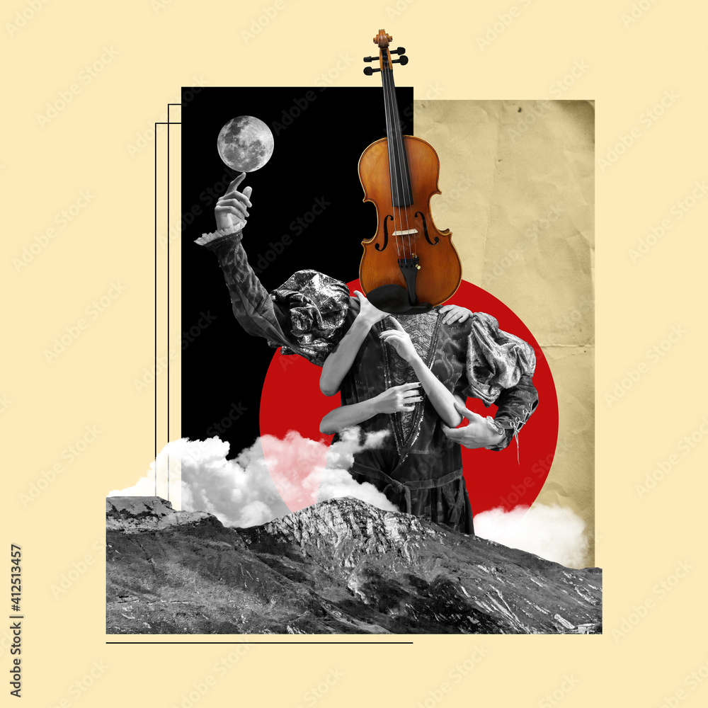 Young man headed by violin behing the mountain on geometric background. Negative space to insert your text. Modern design. Contemporary colorful and conceptual bright art collage, art collage. Visual