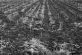 Fire burns stubble on the field destroy summer. Fire residue of agricultural field.