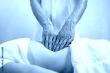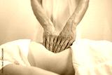 Male masseur makes visceral massage of internal organs through the stomach to a young woman in a spa room
