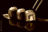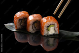 Eating sushi rolls with chopsticks. Set on a black background with reflection. Sushi roll with rice, cream chees, salmon, avocado.