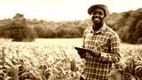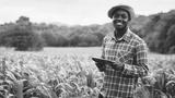African Farmer stand in the green farm with holding tablet.16:9 style