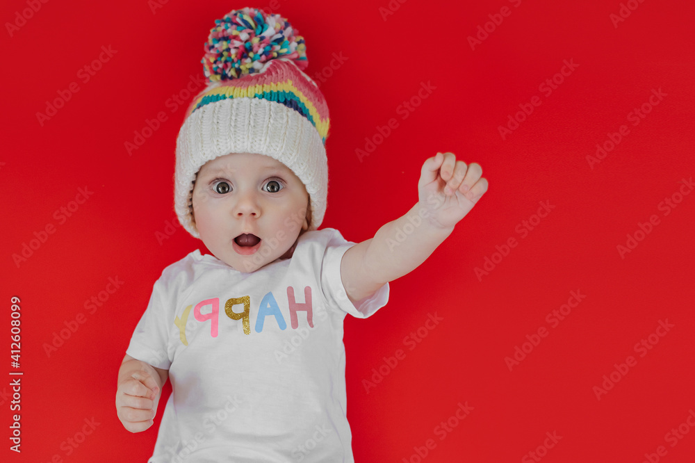 Amazed baby in knitted hat
