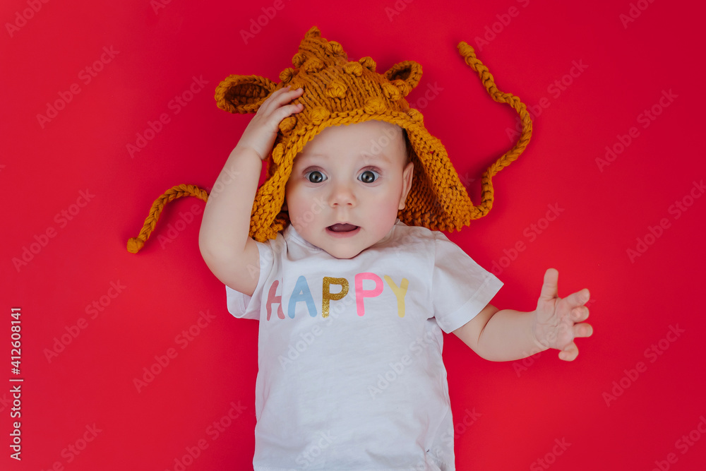 Amazed cute baby in casual t shirt and knitted hat on red background. Expressive adorable infant looking at camera