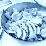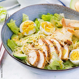 Caesar salad with lettuce, chicken, avocado and croutons on light table.