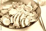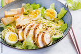 Caesar salad with lettuce, chicken, avocado and croutons on light table.