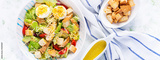 Caesar salad with lettuce, chicken, avocado, cherry tomatoes and croutons on light table. Top view, above, banner