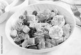 Caesar salad with lettuce, chicken, avocado, cherry tomatoes and croutons on light table.