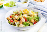 Caesar salad with lettuce, chicken, avocado, cherry tomatoes and croutons on light table.