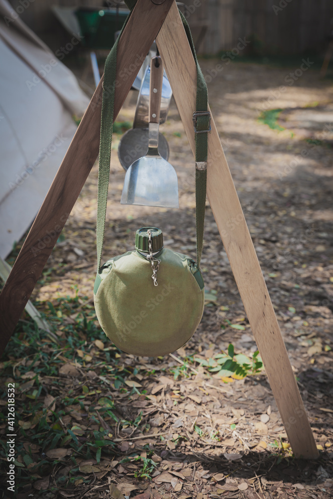 Vintage Children's Water Bottle on Wooden railing .