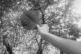 Hand hold a red leaf on forest background.