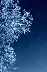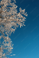 Branches of tree in snow against blue sky. Winter background for design .
