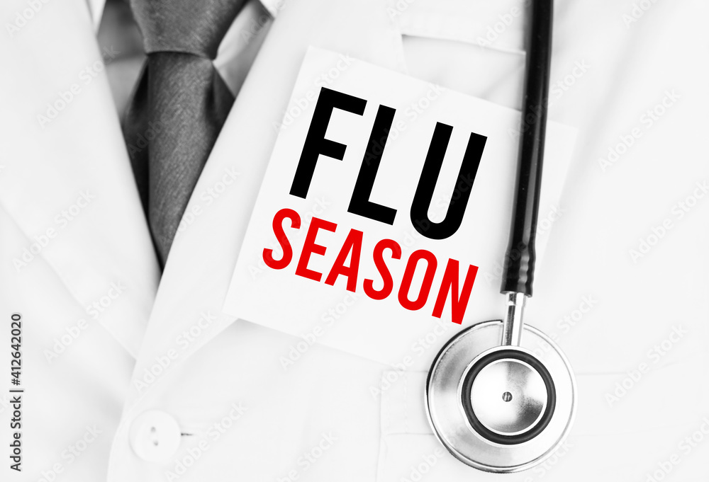 White sticker with text Flu Season lying on medical robe with a stethoscope