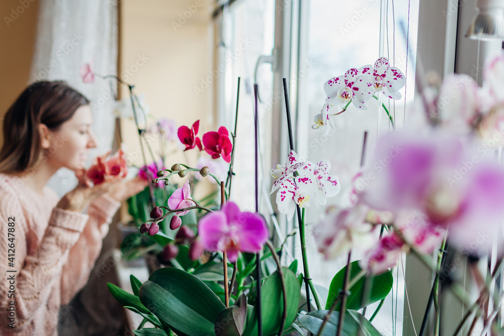 Young woman smelling blooming orchids on window sill. Housewife taking care of home plants and flowers. Hobby