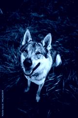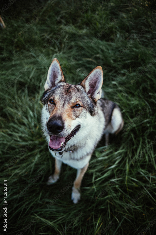 Vertical shot of a wolf-dog lying on the grass at daytime