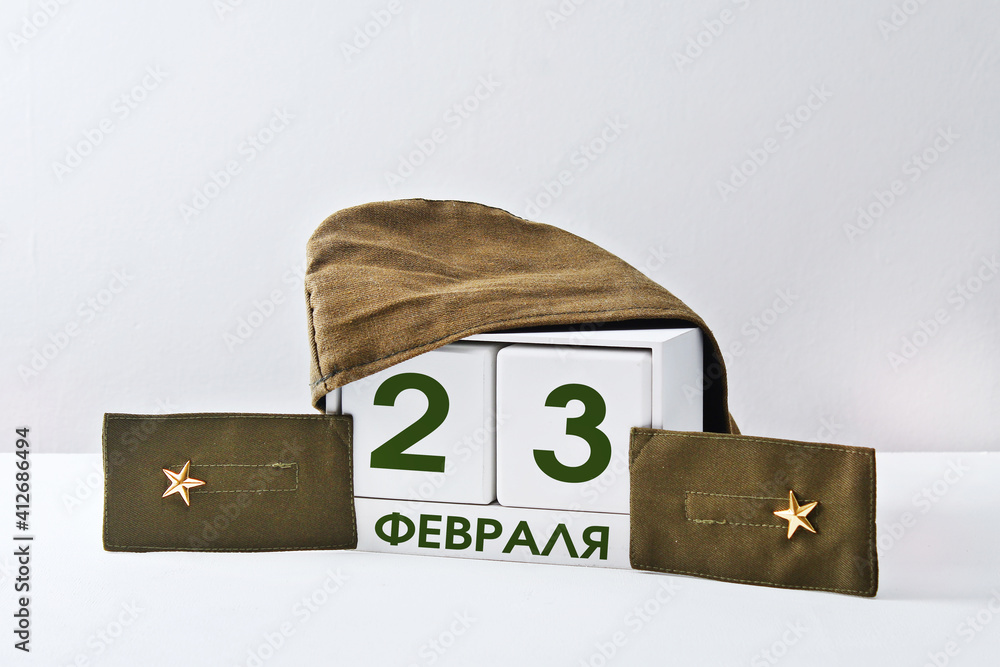 Text in Russian - February 23. White calendar with date 23 February. Russian holiday defender of the fatherland day. Men's holiday.