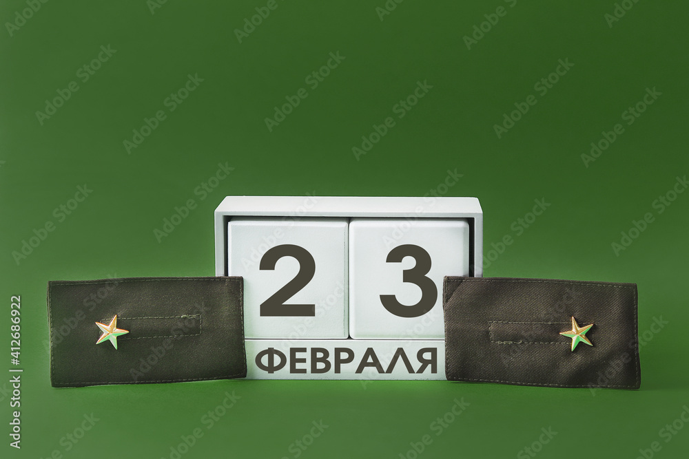 Text in Russian - February 23. White calendar with date 23 February. Russian holiday defender of the fatherland day. Men's holiday.