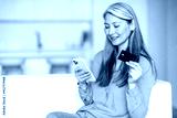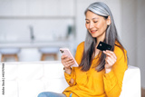 Close-up a credit card and a cellphone in female hands. Defocused asian gray-haired middle aged woman uses a credit card and smartphone, buys and pays online, internet banking concept