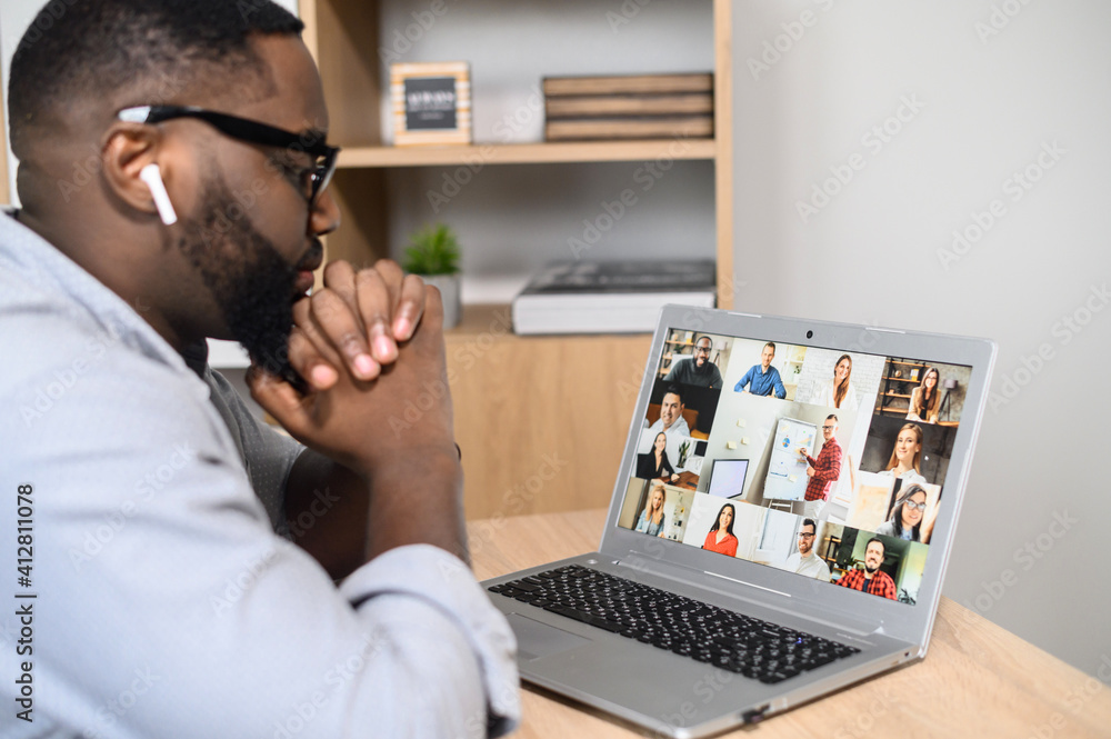 Attentive African American man using the app for distance video communication with coworkers, friends, meeting online, looking at the laptop screen with people profiles, and listening to the lecturer
