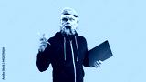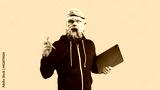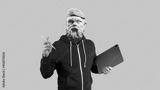 Modern art collage. Concept portrait man holding tablet and pencil. Gypsum head of Socrates.