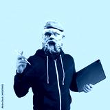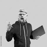 Modern art collage. Concept portrait man holding tablet and pencil. Gypsum head of Socrates.
