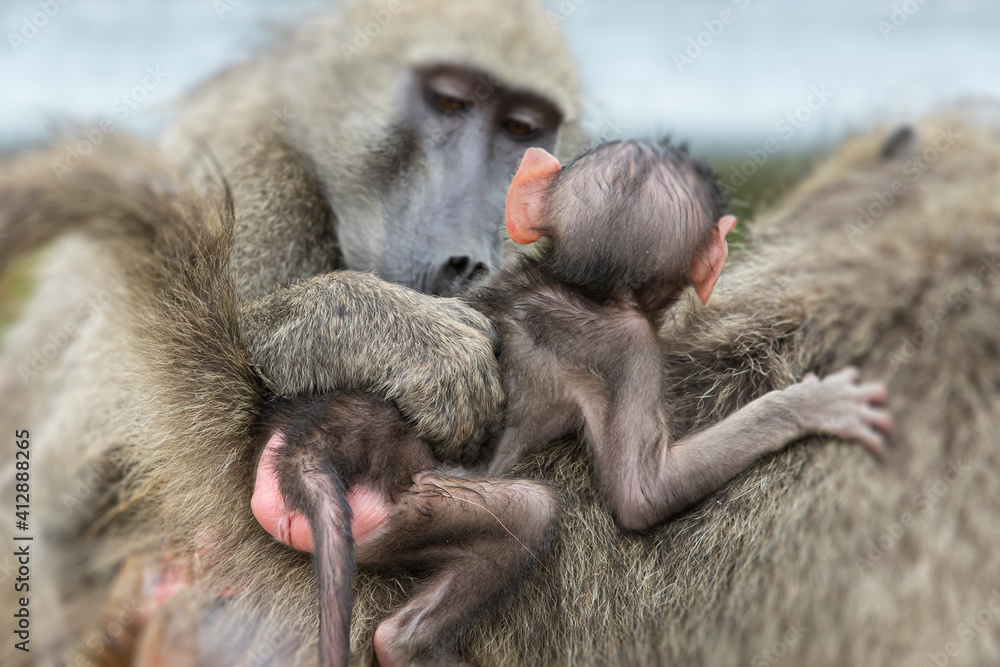 Baboon looking at the new born baby of another female baboon.