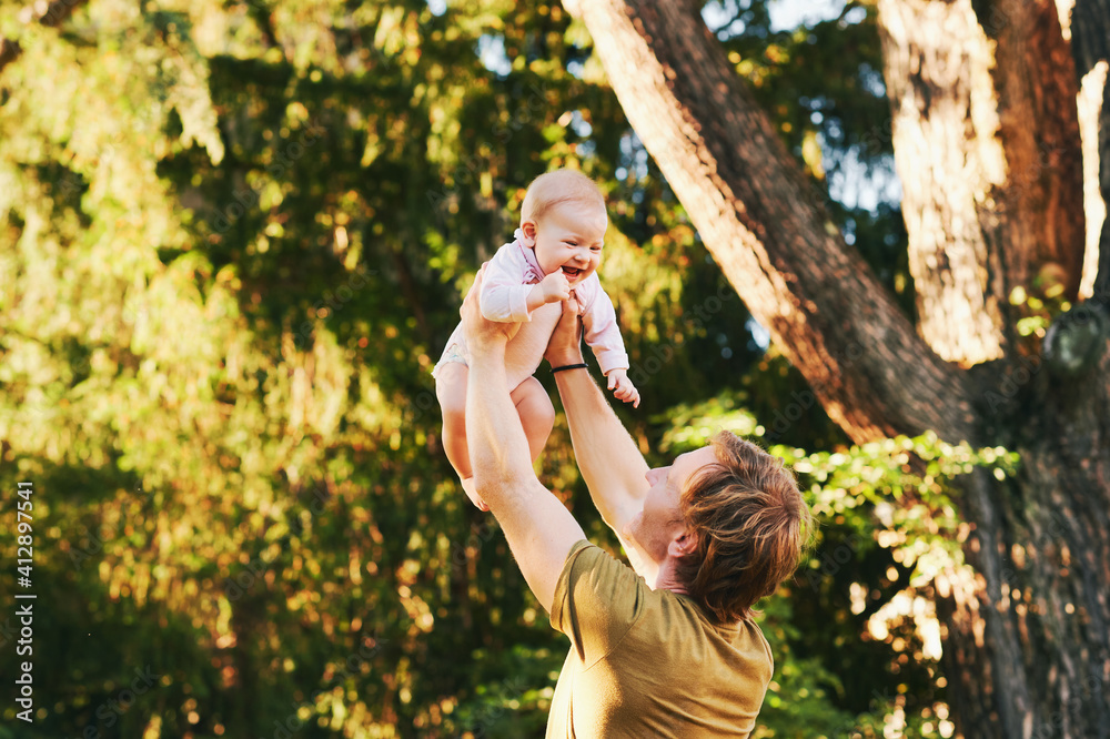 Happy young father playing with adorable baby girl in summer park, family lifestyle, dad holding kid high in the air