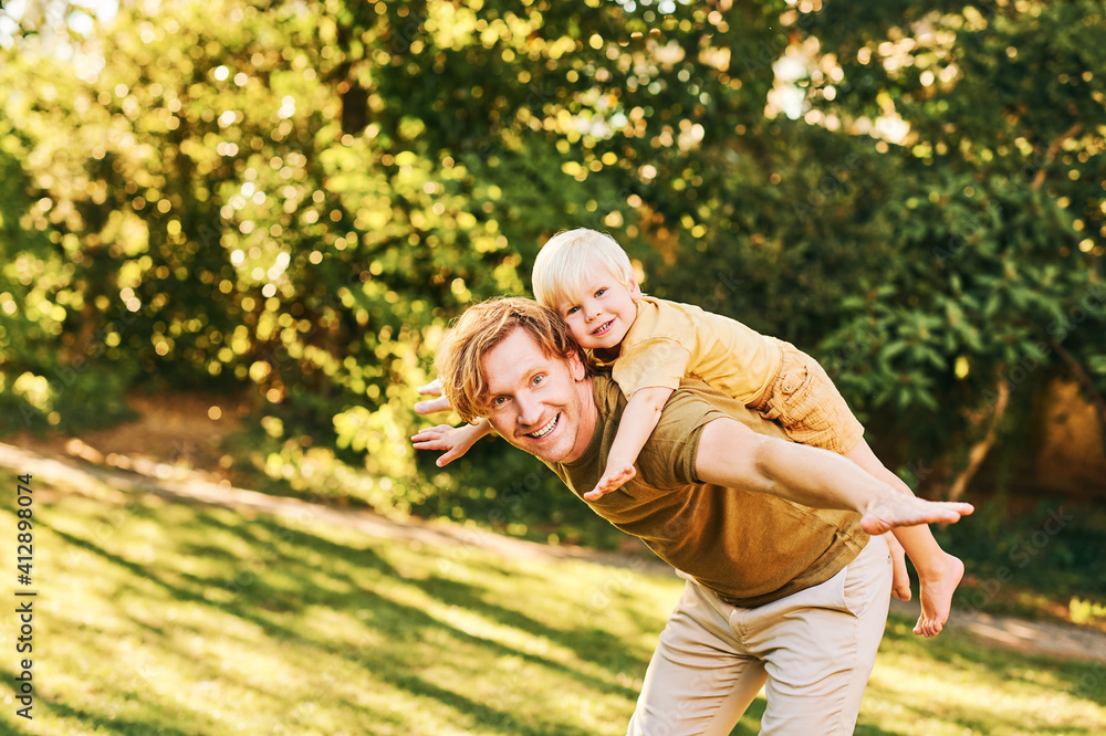 Happy young father playing with toddler son in summer park, piggyback ride