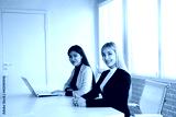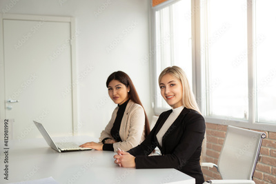 two beautiful young women at the table in the office with a laptop