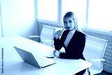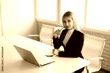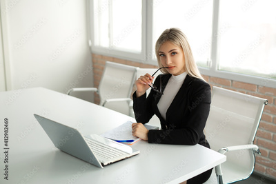 beautiful young woman in a suit at the office at the table with a laptop