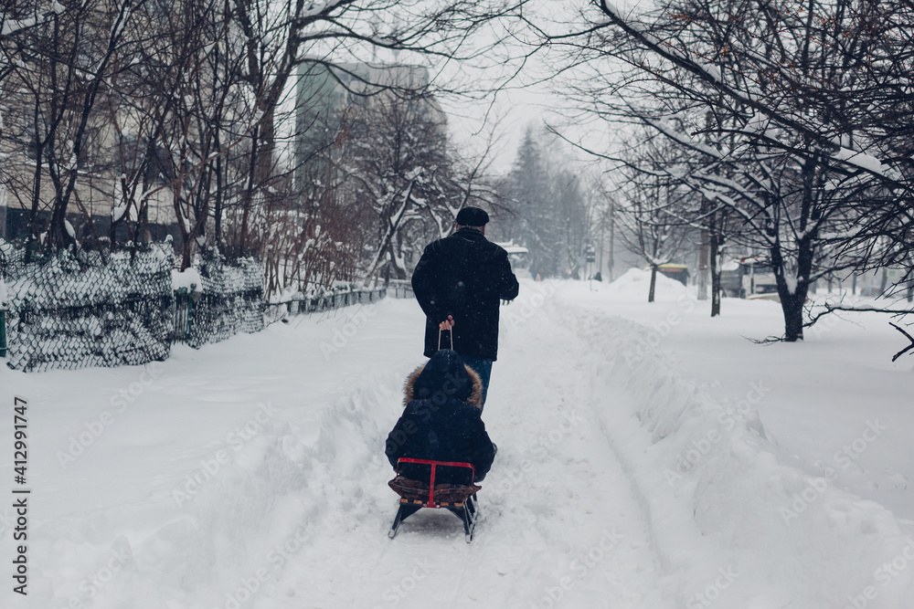 Grandfather pulling sleigh with little boy on city street among snow during snowfall