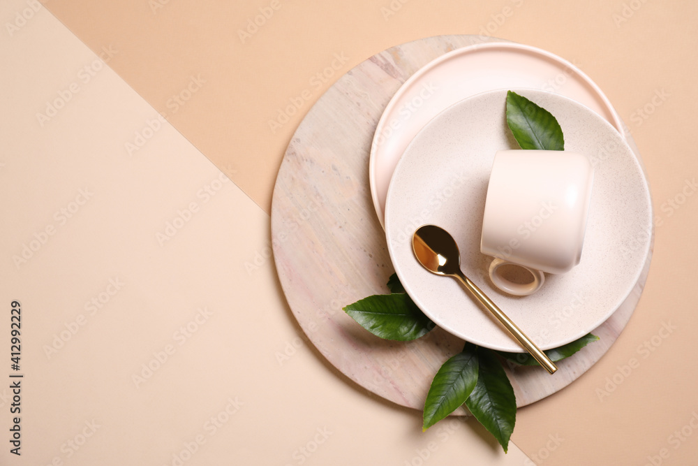 Beautiful table setting with green leaves on beige background, flat lay. Space for text