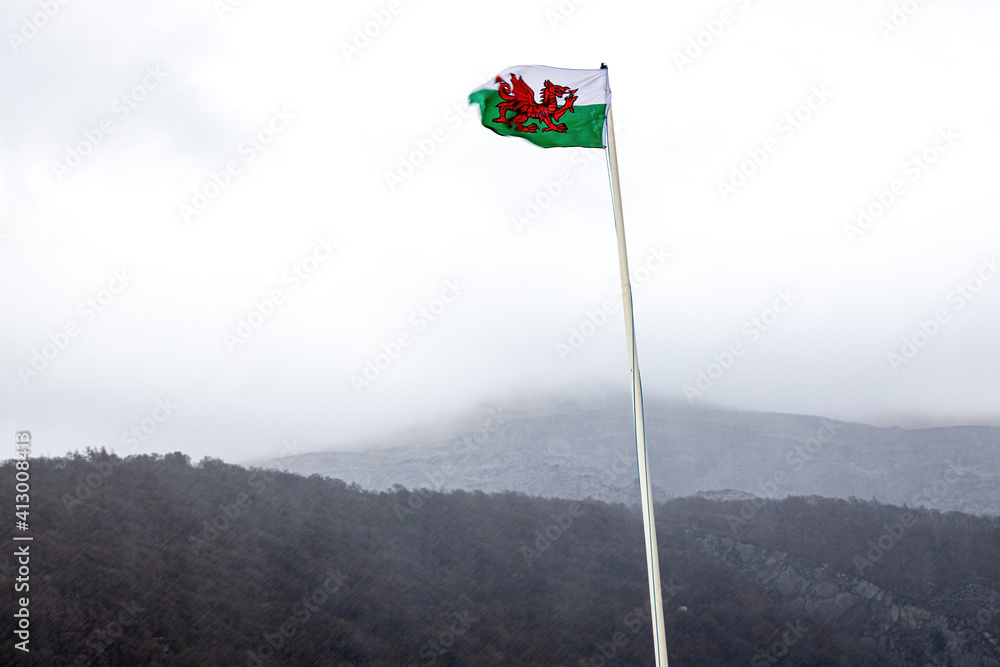 Welsh flag at the lake of Snowdonia at stormy weather, Wales