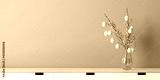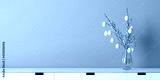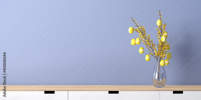 Interior design mockup - easter eggs hanging on a forsythia twig in a glass vase with water. Vase standing on a sideboard. Blue wall. Easter eggs in illuminated yellow with different patterns.