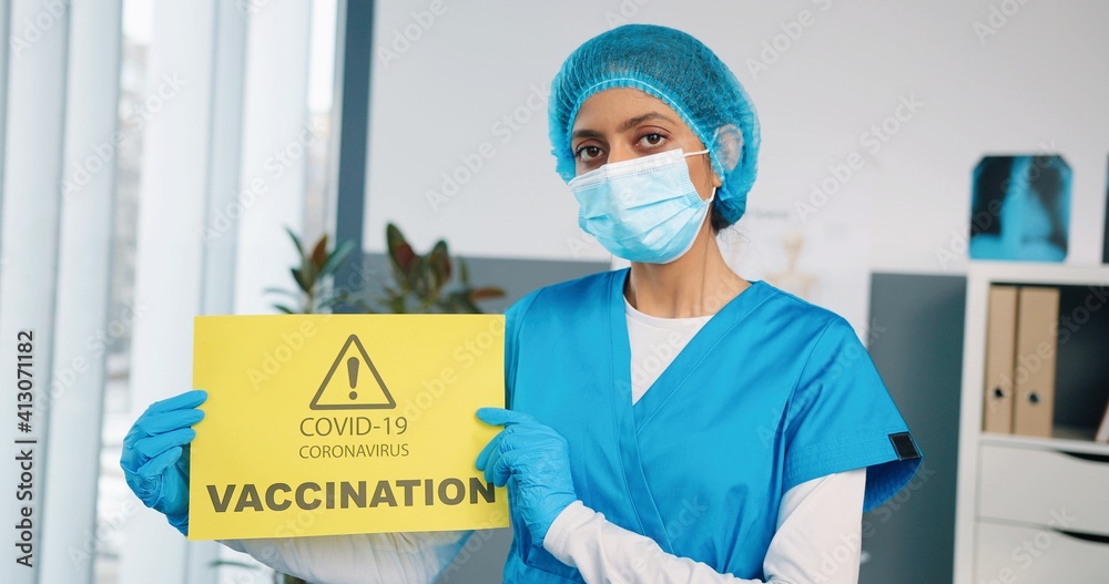 Close up portrait of Hindu young woman specialist nurse in protective gloves and medical mask holding in hands yellow paper card showing announcement about covid vaccination, coronavirus vaccine