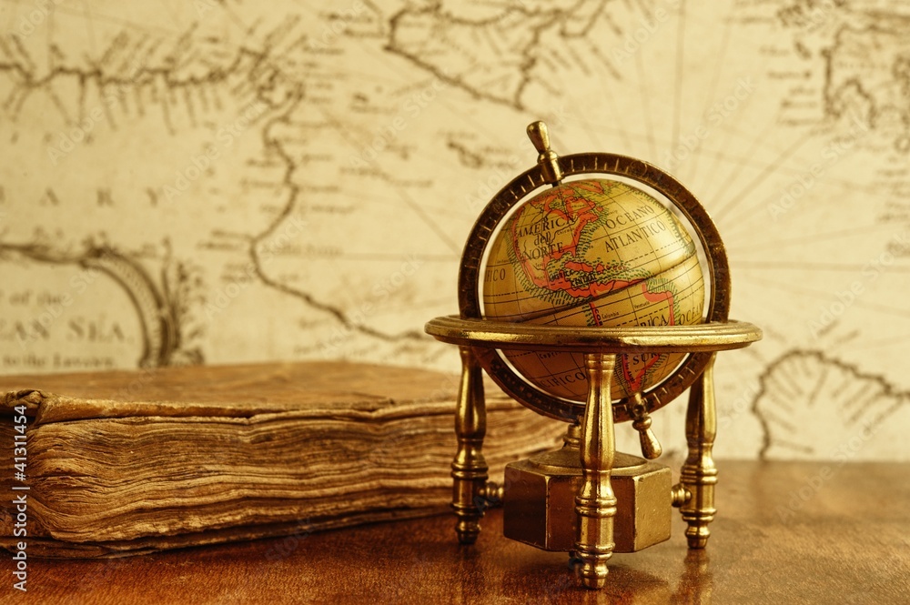 Globe and vintage book against map on a wall.
