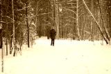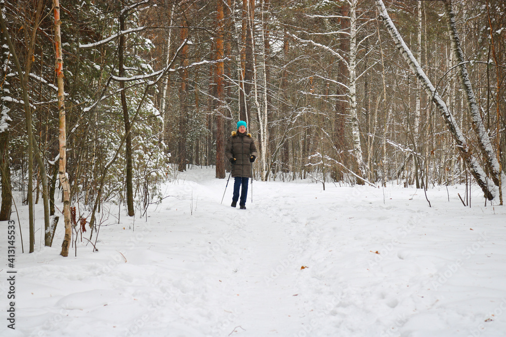 Woman goes in for winter sports - nordic walking, walks with sticks through a snowy forest. Active people in nature.