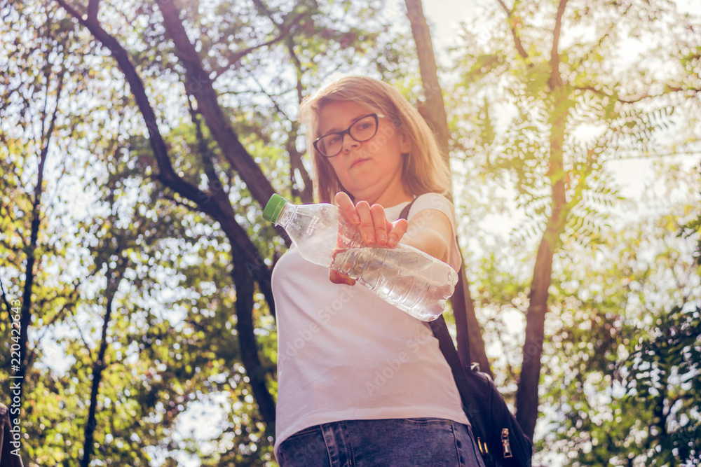 White woman with healthy skin of body and palm leaves. Tanned body of an attractive girl with green plants. Large palm leaves cover the body.