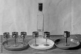 Still life with colorful plates, glasses and a bottle of alcohol on a wooden table top